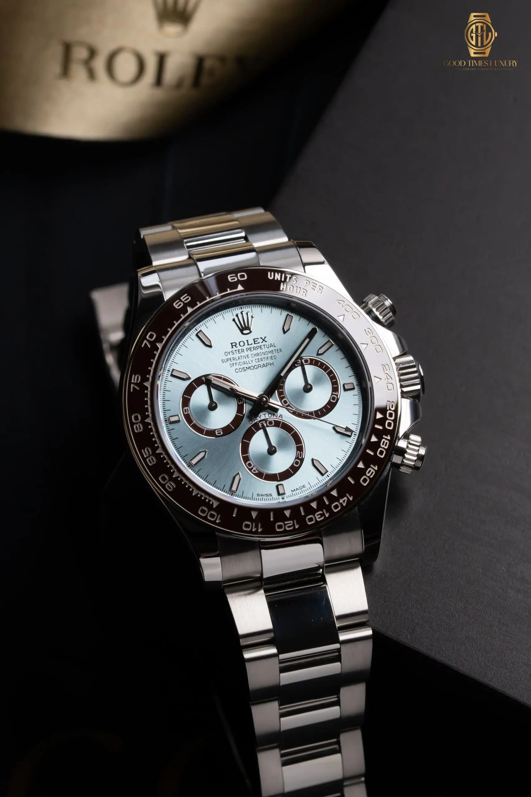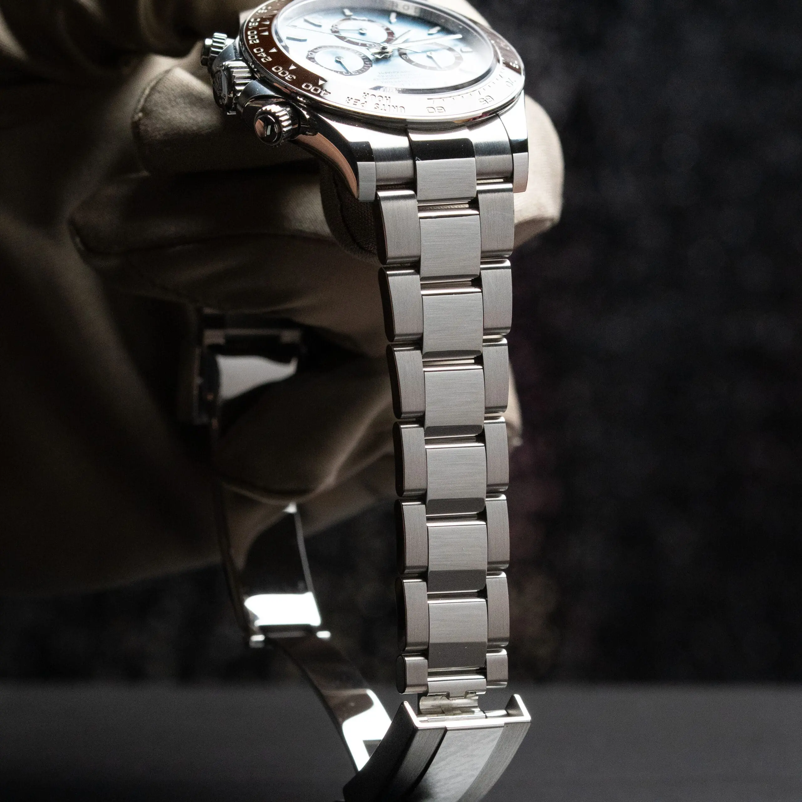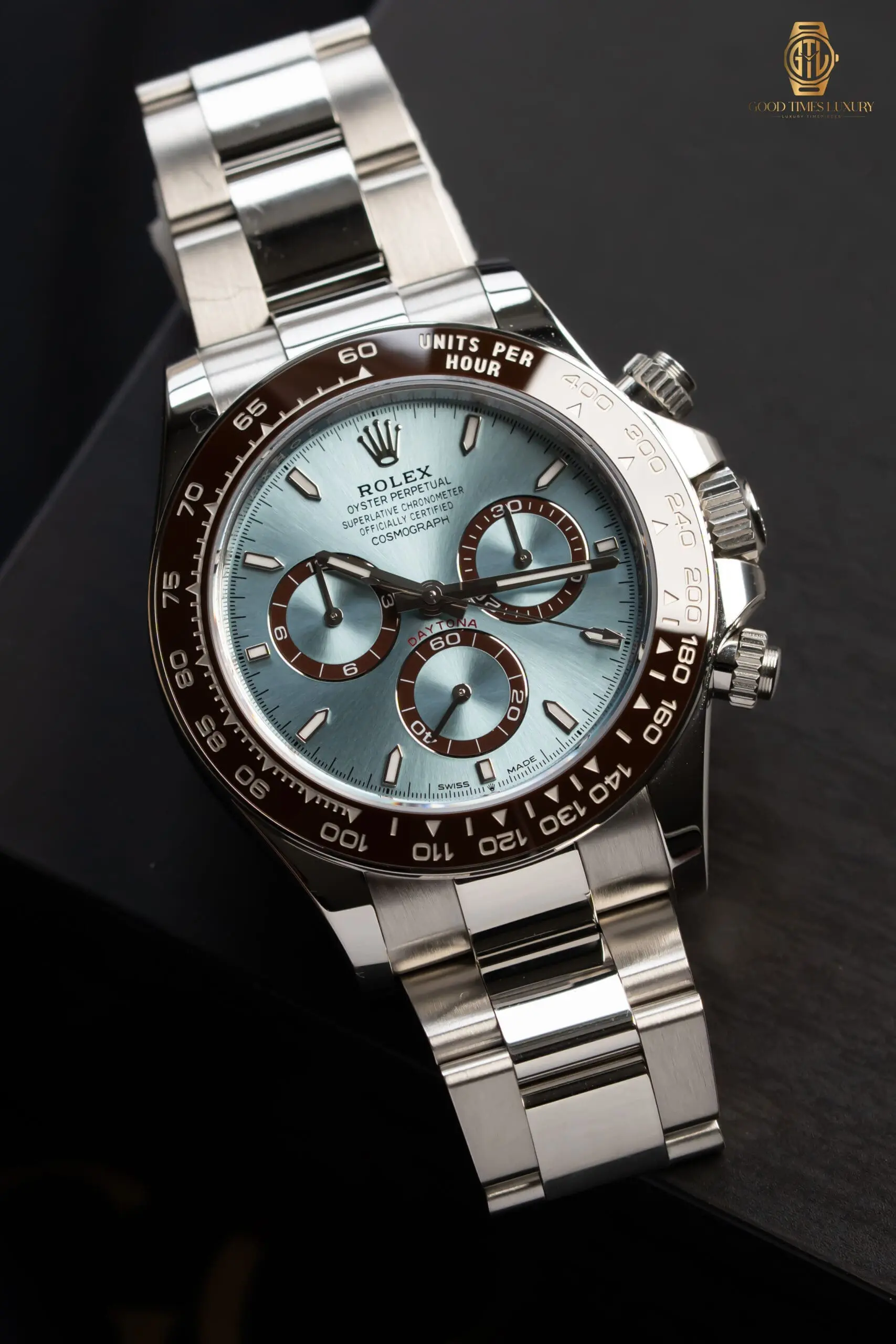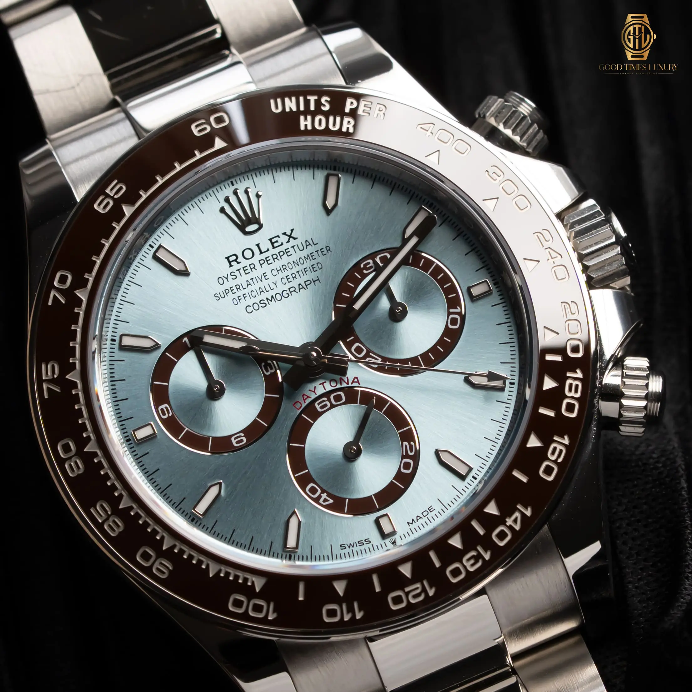 Ice Blue Dial, Chestnut Brown Chronograph rings
