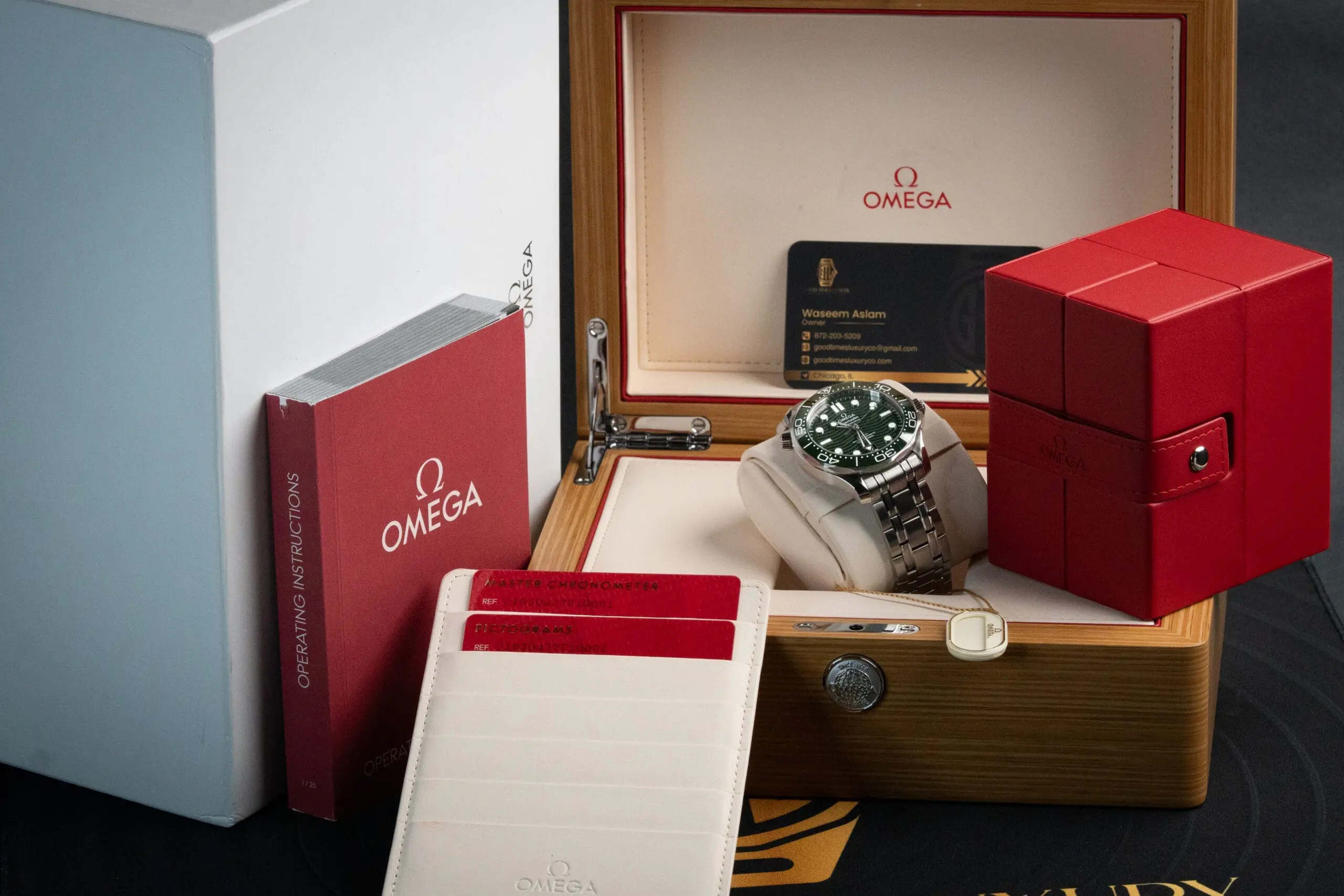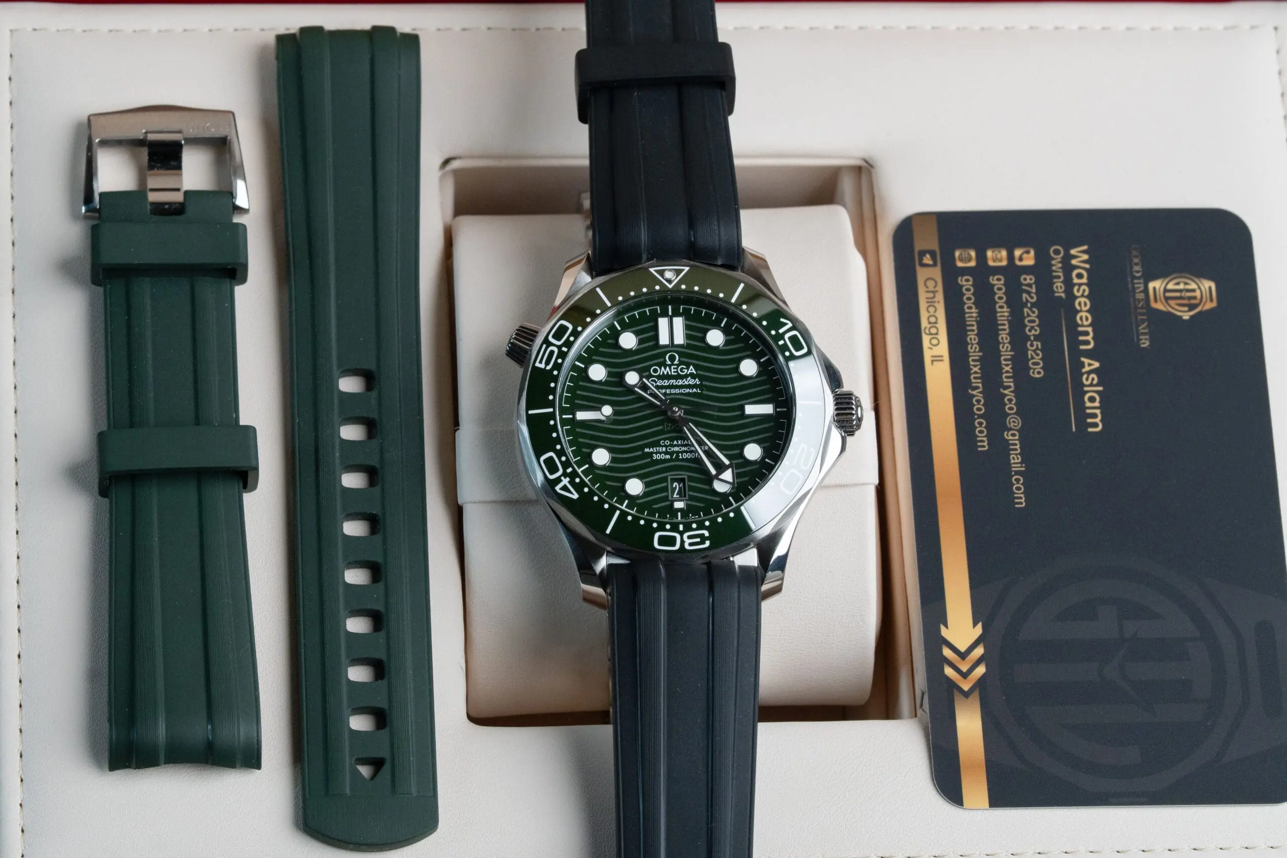 Set comes w/Original boxes, Travel Box, picto card, chrono card, hang Tag, User Manual, After Market Green and Black Rubber straps